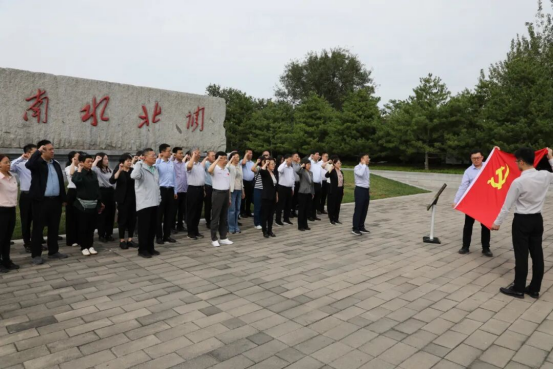 活動(dòng)當(dāng)天上午,全體人員聽(tīng)取基礎(chǔ)設(shè)施部黨支部水利處負(fù)責(zé)同志介紹農(nóng)發(fā)行“水利銀行”品牌建設(shè)情況。下午,前往南水北調(diào)團(tuán)城湖調(diào)節(jié)池開(kāi)展現(xiàn)場(chǎng)教學(xué),參觀南水北調(diào)紀(jì)念園,深入了解南水北調(diào)工程建設(shè)歷程和發(fā)揮作用情況。在“飲水思源”紀(jì)念碑前,全體人員重溫入黨誓詞,面向黨旗莊嚴(yán)宣誓。參觀結(jié)束后,全體人員觀看新華社短片《跟著總書(shū)記“瞰”南水北調(diào)工程》,進(jìn)一步親身感受習(xí)近平總書(shū)記對(duì)人民飲水保障的高度重視和深情掛念。部分青年黨員圍繞“一泓清水潤(rùn)南北、青春接力述擔(dān)當(dāng)”作交流分享,以親身體會(huì)述說(shuō)了南水北調(diào)工程給沿線地區(qū)帶來(lái)的巨大變化,并深情朗誦了歌頌?zāi)纤闭{(diào)工程與農(nóng)發(fā)行履職擔(dān)當(dāng)?shù)母木幵?shī)歌《南水迢迢》。